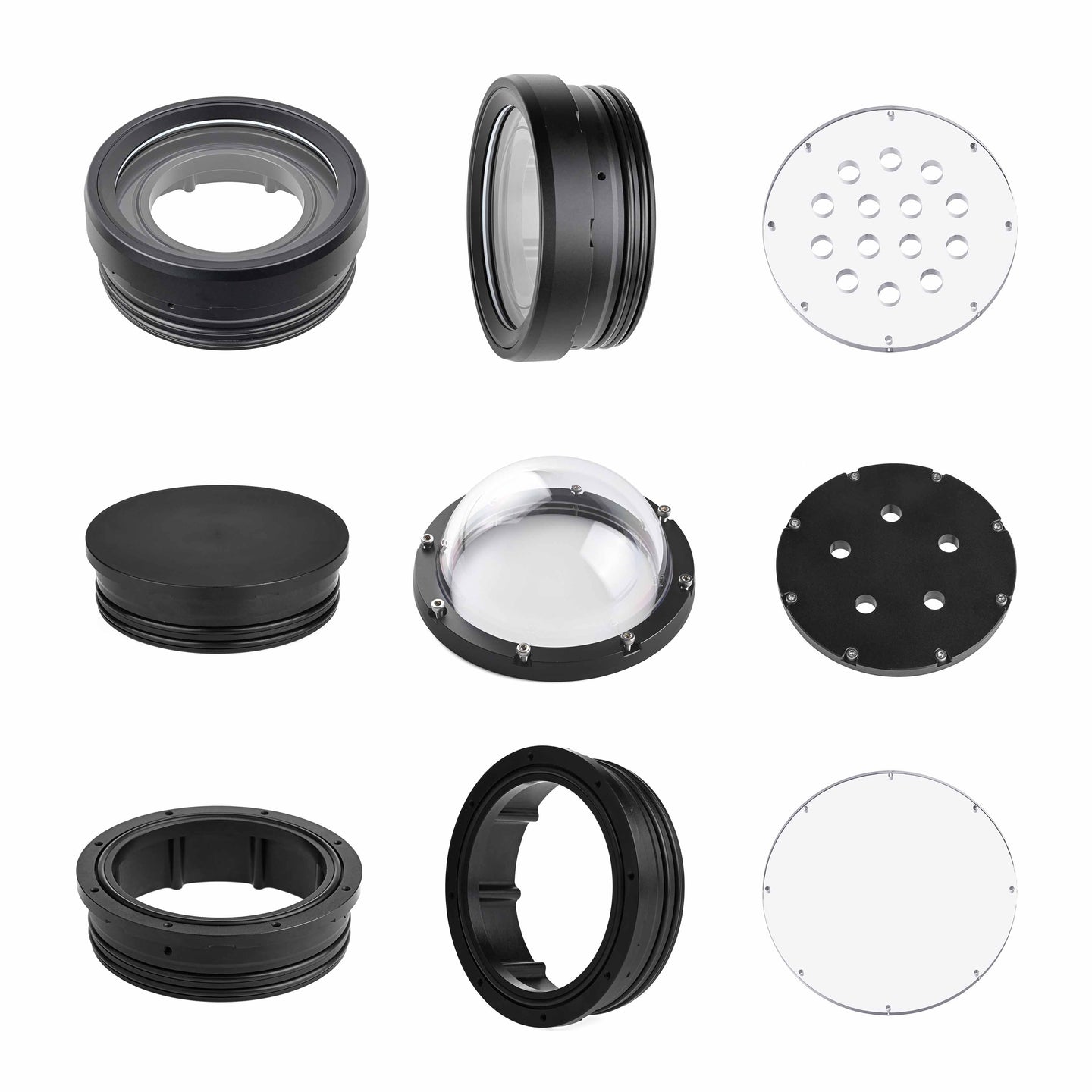 For 115 mm tube systems, additional integrated flange/end-cap options are available, including the Subsea Polymer Flange & End-Cap 115mm for general-purpose shallow-water use, the Subsea Optical Dome Flange & End-Cap 115mm for wide-angle camera systems (requires the Subsea Aluminum Flange), and the Subsea Optical Glass Flange & End-Cap 115mm for precision flat-window imaging and sensor payloads.