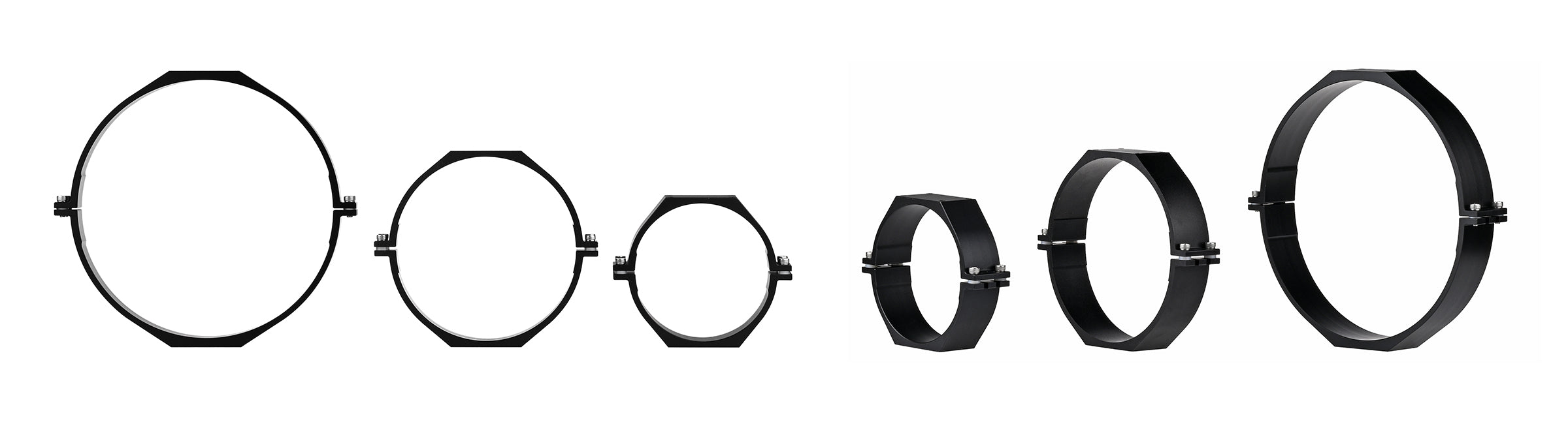 これらのクランプは、外径 85 mm、115 mm、165 mm のBlu-Sub アクリルチューブ専用に設計されています。各クランプの内側形状はチューブの直径に正確に一致し、エンクロージャーを傷つけることなく、確実で振動に強い固定を実現します。