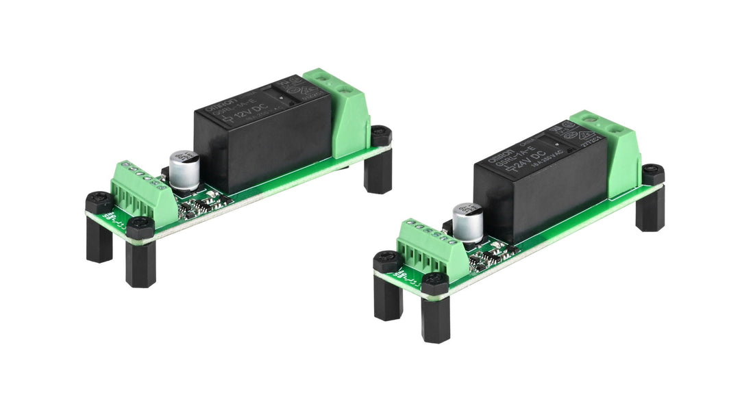 一時的なタップ操作をラッチ式トグル動作に変換します。1 回タップでデバイスをオン、もう 1 回タップでオフに切り替え可能。最大 16 A のスイッチング電流に対応し、デバウンス保護、長押しによる電源オフ、オンボードステータス LED を搭載。12 V および 24 V バージョンを用意しています。