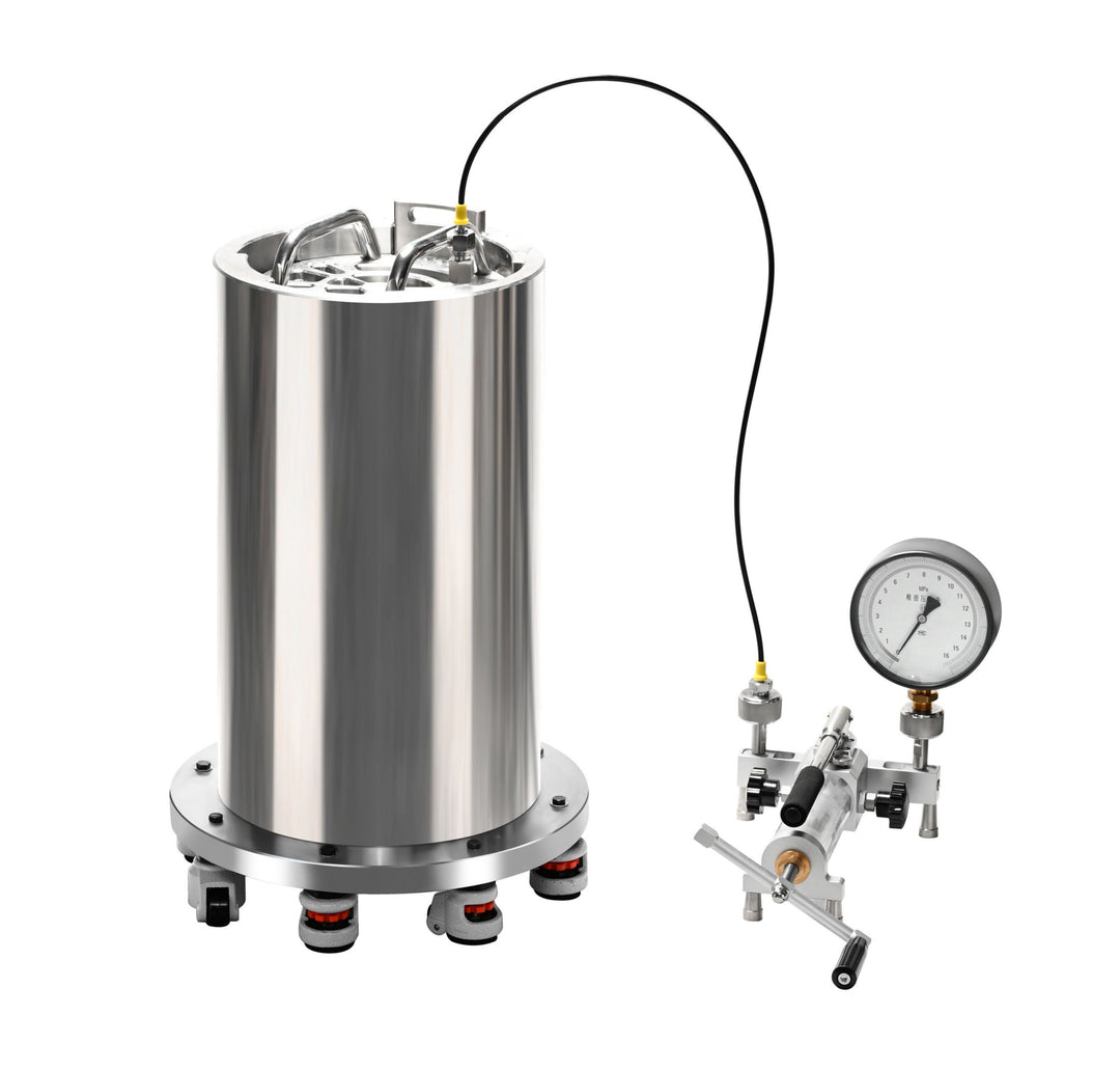 耐水圧試験チャンバー – 10 MPa / 20 L は、耐食性に優れた316ステンレス鋼で構成された業務用の静水圧試験装置です。最大10 MPa(1,000 mの水深に相当)の水圧を安全に再現でき、水中筐体、ケーブル貫通部、コネクタなどの耐圧性能を検証するのに最適です。