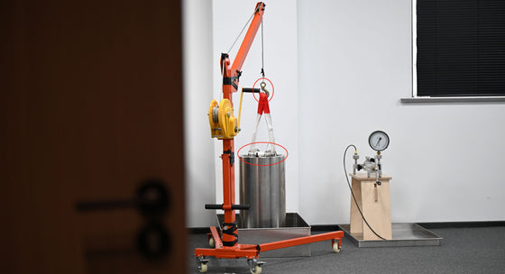 チャンバーにはクイックカップリングが装備されており、圧力接続を容易に行えます。0~10 MPaの圧力範囲に対応し、0~16 MPaまで測定可能なゲージとポンプを備えています。また、排出液を受けるスチールドリップトレイと、平坦な床面での移動を補助する8個の支点ホイールが付属しています。重量は約200 kgあるため、クレーンなどの適切な揚重機器を使用して移動する必要があります。